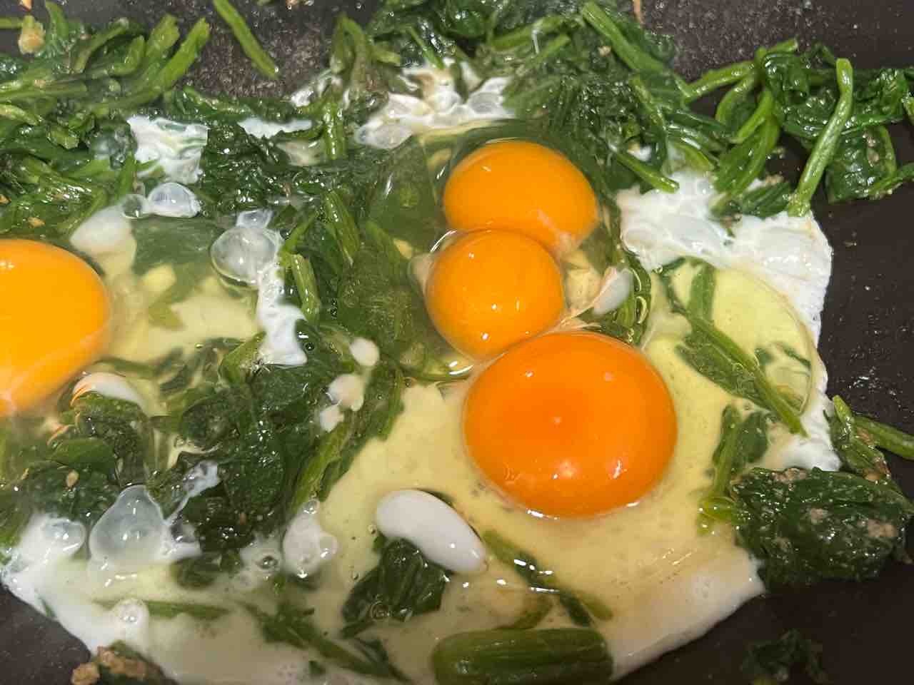あと数日前、残り物のほうれん草のお浸しを卵焼きに変身中、