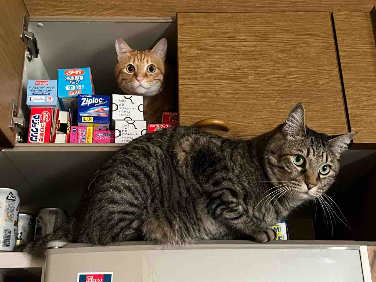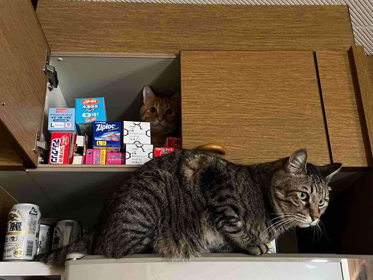 最初に、玄関に通じる近い場所として、冷蔵庫の上にある棚内に